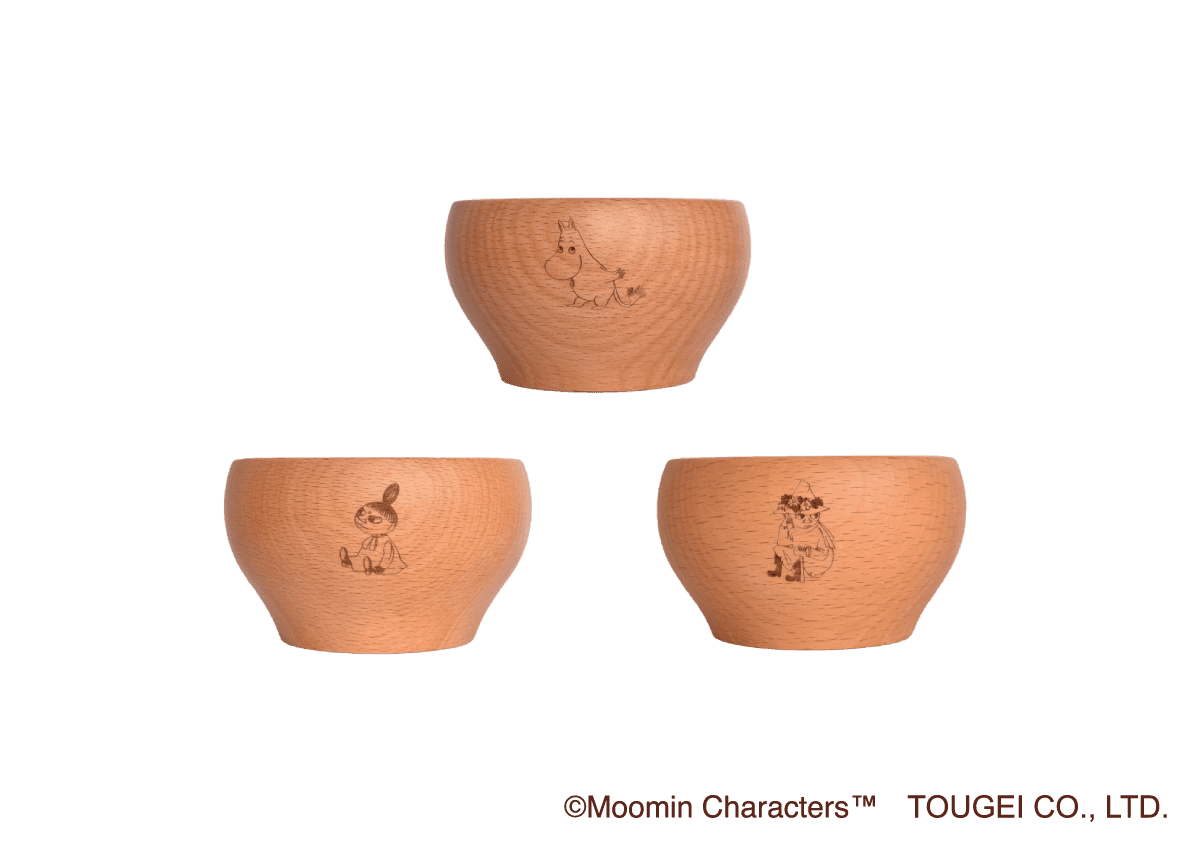 ムーミンと仲間たちが物語の中から飛び出して木製のかわいらしいお椀になりました。
